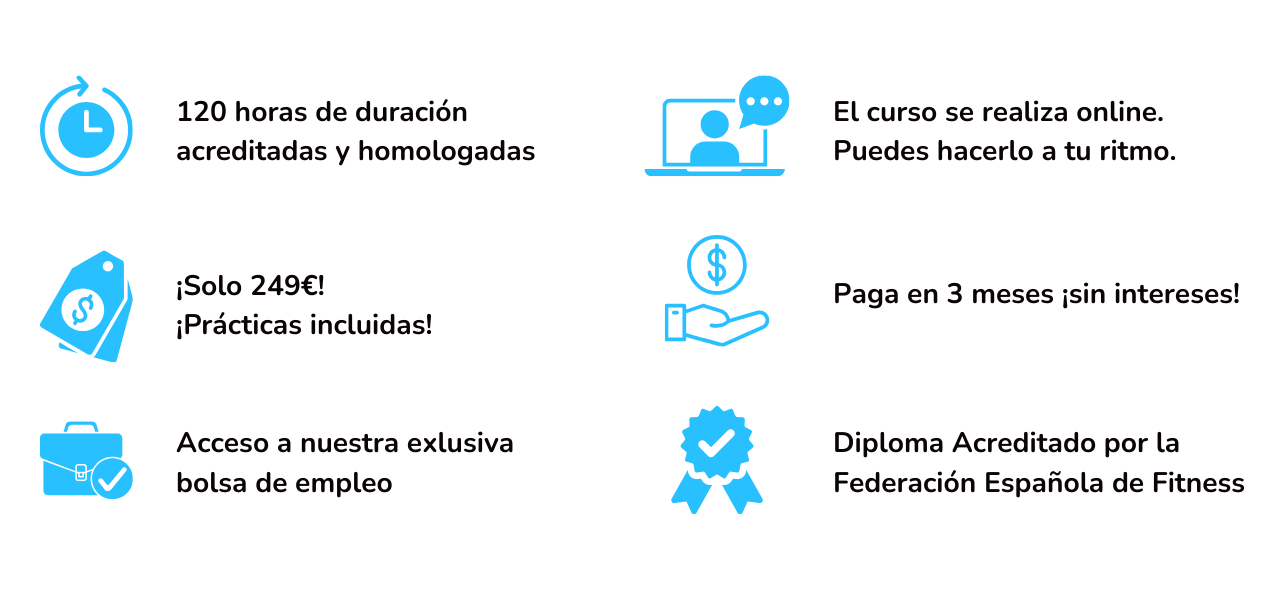 Una vez terminado el curso te enviaremos el diploma de la Federación Española de Fitness, con el número de horas cursadas y los conocimientos adquiridos. Este título está acreditado por la Federación y válido para trabajar internacionalmente.